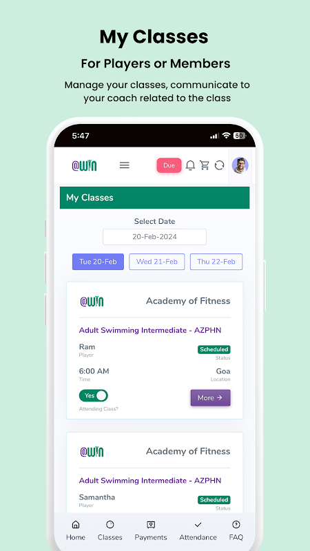 AtWin হল একটি ক্লাউড-ভিত্তিক স্পোর্টস ম্যানেজমেন্ট প্ল্যাটফর্ম যা ক্রীড়া একাডেমিগুলিকে তাদের ক্রিয়াকলাপগুলিকে রূপান্তরিত করে এবং গ্রাহকের অভিজ্ঞতা বৃদ্ধি করে শক্তিশালী করে। এখানে AtWin এর কিছু মূল বৈশিষ্ট্য রয়েছে: