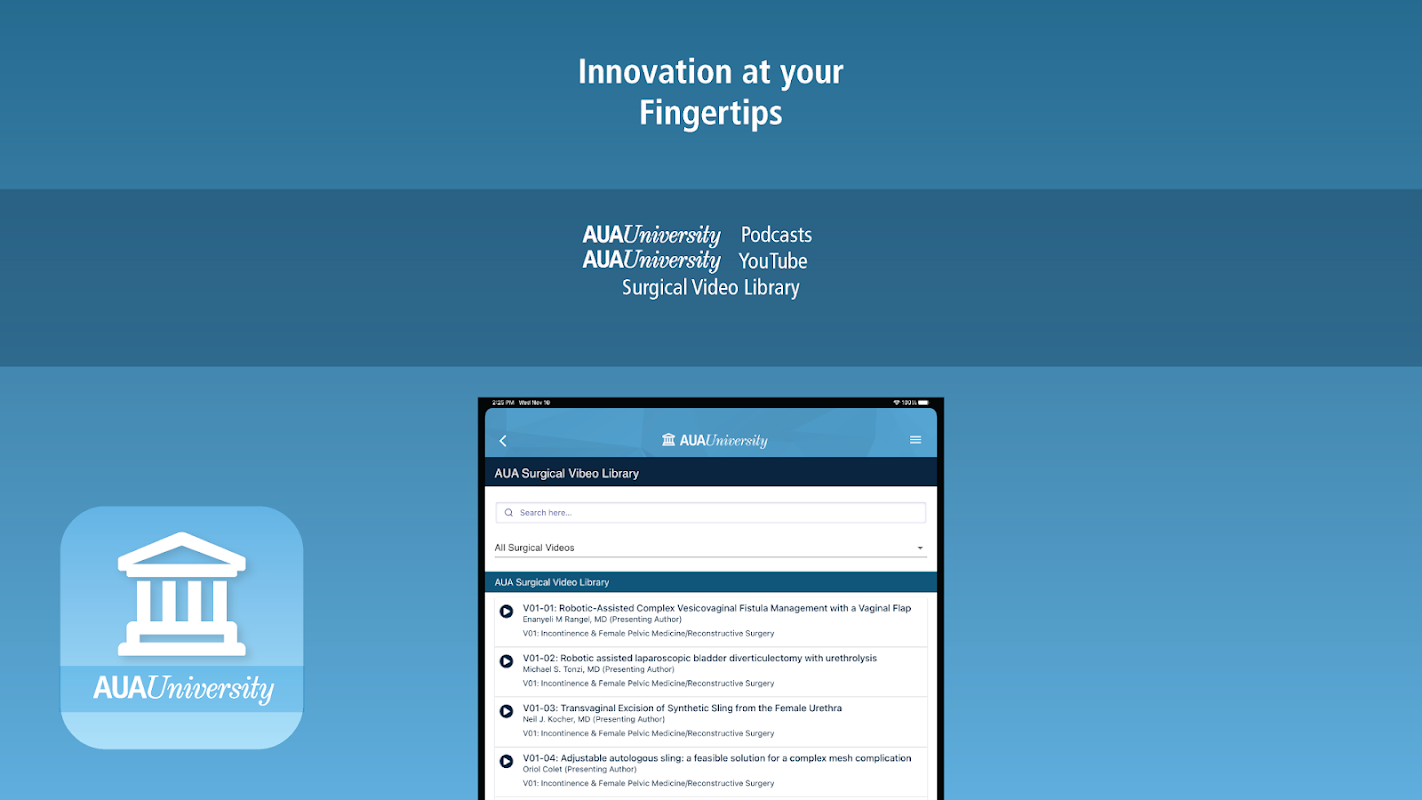 AUAU University অ্যাপটি AUA-এর জনপ্রিয় ক্লিনিকাল বিষয়বস্তু জুড়ে অনুসন্ধানের জন্য তাত্ক্ষণিক অ্যাক্সেস প্রদান করে।
