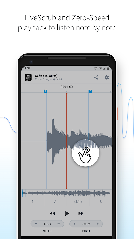 • জিরো -স্পিড প্লেব্যাক - স্পিড 0 তে সেট করুন অথবা নির্দিষ্ট নোট শোনার জন্য কেবল তরঙ্গাকারে আলতো চাপুন এবং ধরে রাখুন
