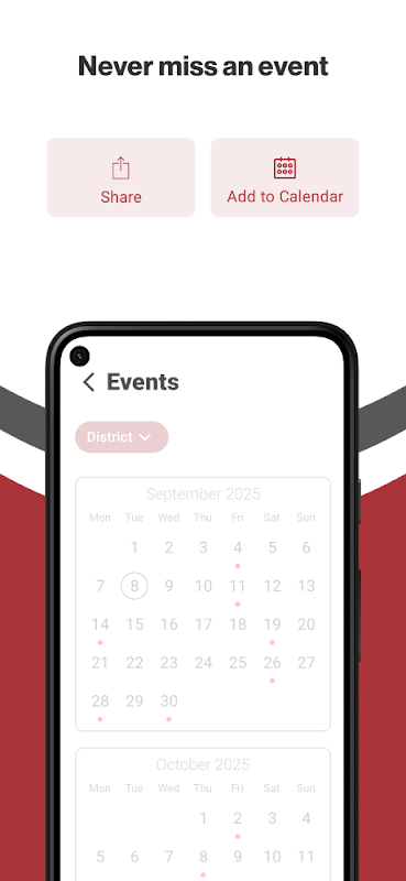 ইভেন্ট বিভাগটি জেলা জুড়ে ইভেন্টের একটি তালিকা দেখায়। ব্যবহারকারীরা তাদের ক্যালেন্ডারে একটি ইভেন্ট যোগ করতে পারেন এবং একটি ট্যাপ দিয়ে বন্ধু এবং পরিবারের সাথে ইভেন্টটি শেয়ার করতে পারেন।