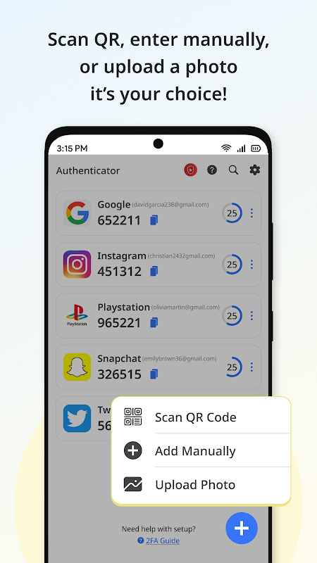 QR কোড স্ক্যান করুন বা আপনার অনলাইন অ্যাকাউন্ট থেকে দুই ফ্যাক্টর প্রমাণীকরণে ম্যানুয়ালি অ্যাকাউন্ট যোগ করুন।