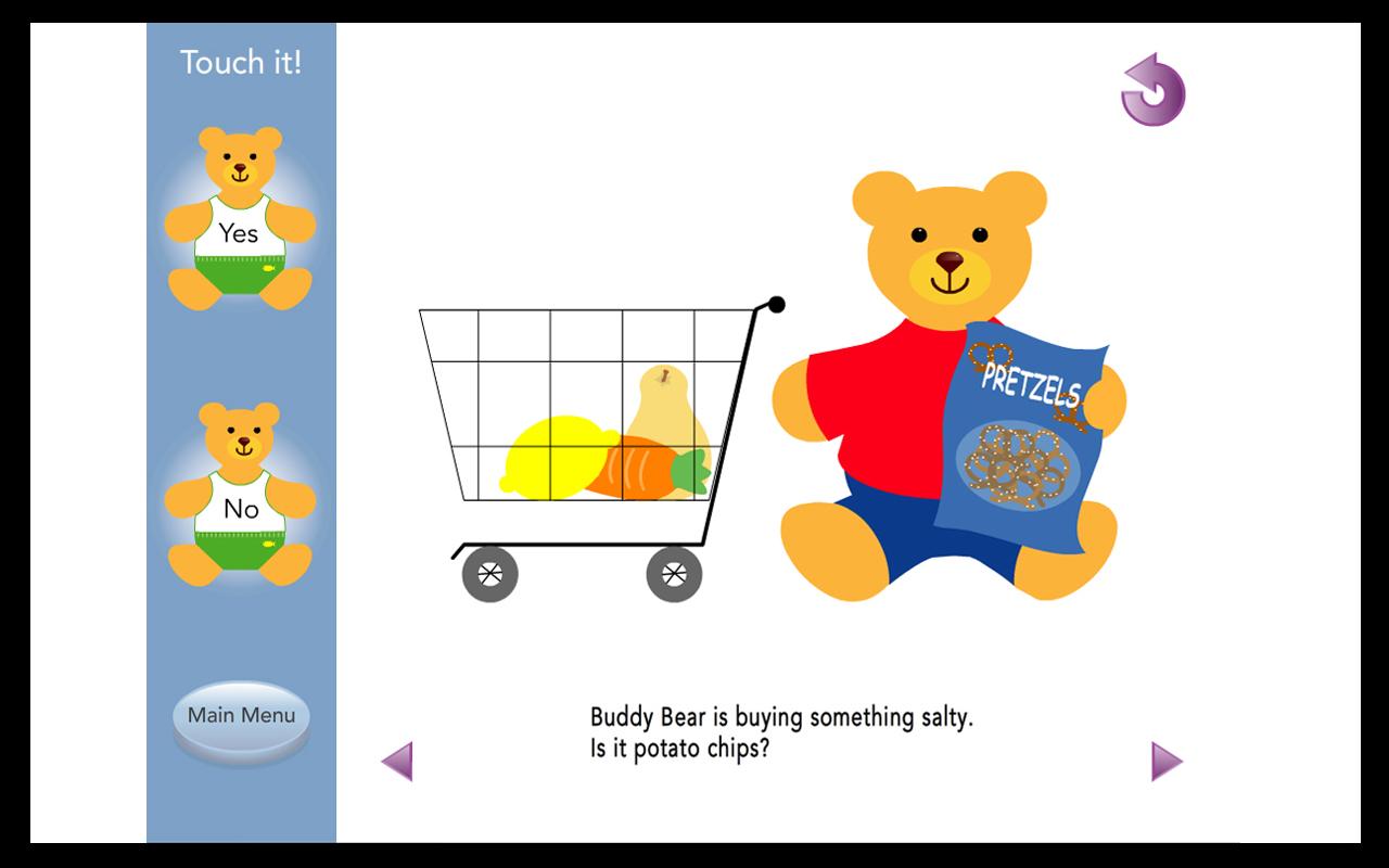 This app teaches yes/no questions and develops joint attention, reciprocity, and early language skills. Each answer screen has two Buddy Bears—one is nodding “yes” and the other is shaking his head “no.” Children touch the Buddy Bear who answers the question correctly.
