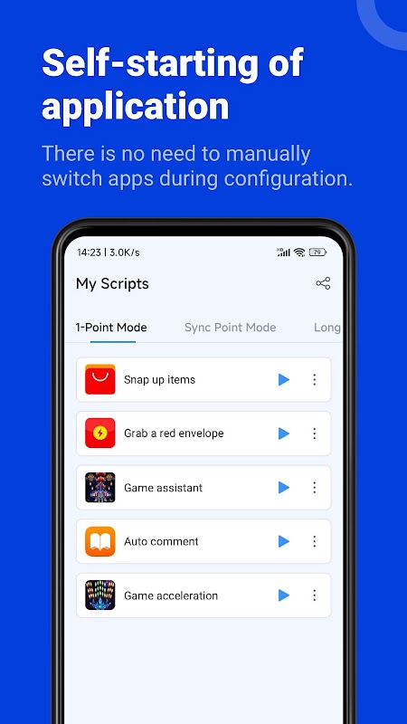 অপারেশনটি সহজ, আপনাকে শুধুমাত্র মোবাইল ফোনের স্ক্রিনে সঞ্চালিত ক্রিয়াটি পরিচালনা করতে হবে এবং তারপর এটি আপনাকে স্বয়ংক্রিয়ভাবে সম্পাদিত ক্রিয়াটি সম্পূর্ণ করতে সহায়তা করতে পারে (ক্রিয়াগুলির মধ্যে রয়েছে একক ক্লিক, একাধিক ক্লিক, স্লাইড, দীর্ঘ প্রেস, ইত্যাদি)।