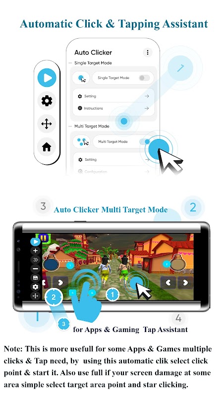 গেম ও অ্যাপের জন্য অটো ক্লিকার এবং স্বয়ংক্রিয় ট্যাপিং মোবাইল ফোন সহকারী অ্যাপ।