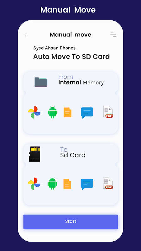 অনায়াসে মাত্র কয়েকটি ট্যাপ দিয়ে নির্দিষ্ট ফাইল বা সম্পূর্ণ ডিরেক্টরি নির্বাচন করুন। আমাদের স্বজ্ঞাত ইন্টারফেস আপনাকে ফাইল এক্সটেনশনের উপর ভিত্তি করে আপনার ফাইলগুলিকে সুবিধামত সংগঠিত এবং ব্যাকআপ করার অনুমতি দেয়, প্রক্রিয়াটিকে আরও দ্রুত এবং আরও দক্ষ করে তোলে। এই অ্যাপ ব্যবহারকারীদের তাদের মোবাইলে মেমরি স্পেস বজায় রাখতে সাহায্য করবে। মিডিয়া ফাইলগুলি একটি মোবাইলে সর্বাধিক স্থান ক্যাপচার করে, এই অ্যাপের সাহায্যে আপনি ফোনের মেমরি সংরক্ষণ করতে SD কার্ডে মিডিয়া ফাইলগুলি স্বয়ংক্রিয়ভাবে স্থানান্তর করতে পারেন। # এসডি কার্ড ছাড়া ব্যবহারকারীদের জন্য বৈশিষ্ট্য