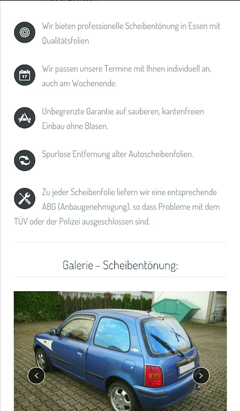 Unsere Mitarbeiter mit langjähriger Erfahrung bieten Ihnen schnellen und unkomplizierten Service rund um die Verglasung ihres Fahrzeugs an. Wir bieten AUTOGLAS Einbau und Steinschlagreparatur in unserer Werkstatt für Teilkasko Versicherte und nicht Teilkasko Versicherte an.Wir bieten professionelle Scheibentönung in Essen mit Qualitätsfolien. Wir passen unsere Termine mit Ihnen individuell an, auch am Wochenende.
