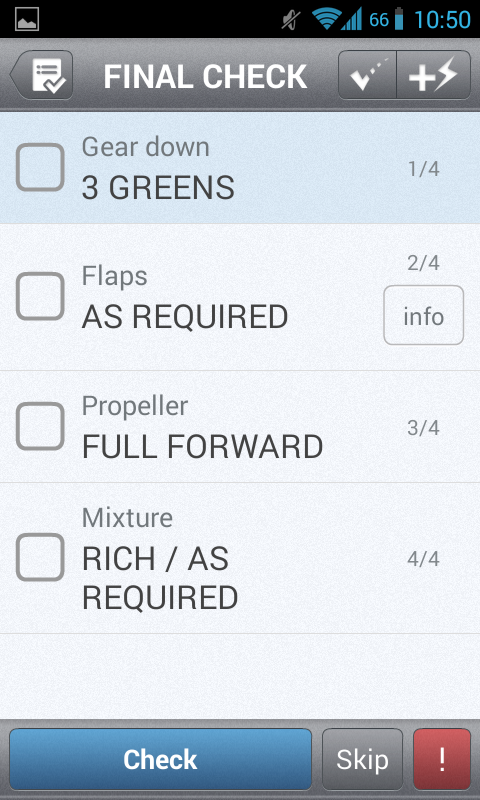 গ্রাফিক্যাল ইন্টারফেসটি বিমানে খুব সহজ এবং সহজেই পড়া যায়। চেকলিস্টগুলি চার স্তরে সংগঠিত হয়। বাজারে অন্য কোনও অ্যাপ্লিকেশনটির চারটি স্তর নেই, বিমানের প্রয়োজন।