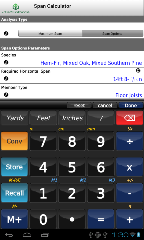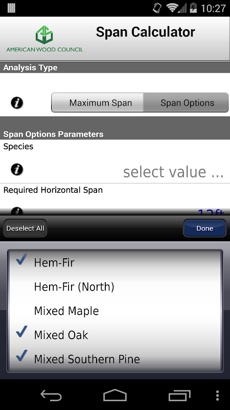 কাঠ নির্মাণ সম্পূরক জন্য 2012 ন্যাশনাল ডিজাইন Specification® (NDS®) অন্তর্ভুক্ত হিসাবে আমেরিকান কাঠ কাউন্সিল (AWC) কাঠ joists এবং আরোহনকারীরা জন্য স্প্যানের ক্যালকুলেটর (স্প্যান ক্যালক) সব প্রজাতির এবং বাণিজ্যিকভাবে উপলব্ধ কোমল কাষ্ঠ ও শক্ত কাঠওয়ালা ঢিকিয়ে বাংলাদেশের জন্য হিসাব সম্পাদন করে: মার্চ 2012 এবং মার্চ 2013 addenda সঙ্গে কাঠ নির্মাণ জন্য ডিজাইন মূল্যবোধ. সাধারণ লোড অবস্থার জন্য joists এবং বরগা ঘটনাকাল নির্ধারণ করা যেতে পারে. বিঘত অপশন ক্যালকুলেটর তুলনা উদ্দেশ্যে একাধিক প্রজাতি এবং বাংলাদেশের নির্বাচন করতে পারবেন.