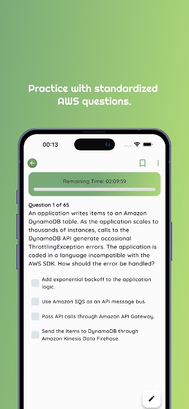 আমাদের অ্যাপের মাধ্যমে AWS সার্টিফাইড ডেভেলপার অ্যাসোসিয়েট (DVA C02) পরীক্ষায় মাস্টার্স করুন
