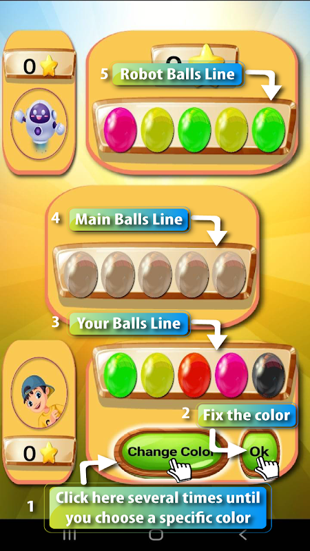 যখন গেমটি শুরু হয় তখন লুকানো বলের 3টি প্রধান লাইন থাকবে, প্রতিটি লাইনে 5টি বল রয়েছে এবং আপনার কাছে আপনার নিজস্ব লাইন থাকবে প্রতিটি বলের কোন রঙগুলি মূল লাইনের মতো একই ক্রমে অনুমান করার জন্য, যদি আপনি 1টি রঙিন বল আঘাত করেন তবে আপনি 1 পয়েন্ট পান কিন্তু যদি এটি একটি কালো বল হয়, তাহলে আপনি 15 পয়েন্ট অর্জন করবেন, যার অর্থ অন্য লাইনের মধ্যে না গিয়ে অবিলম্বে গেমটি জিততে হবে। কিন্তু মনোযোগ দিন, কালো বলটি শুধুমাত্র একটি লাইনে একবার দেখা যায়, যদি আপনি এটি একবার দেখেন তবে পরবর্তী লাইনগুলির জন্য আপনাকে অনুমান করার দরকার নেই। মনে রাখবেন যে আপনি এমন একটি রোবটের বিরুদ্ধে খেলবেন যা আপনাকে পরাজিত করতে পারে, তাই সঠিকভাবে অনুমান করার চেষ্টা করুন। শুভকামনা!