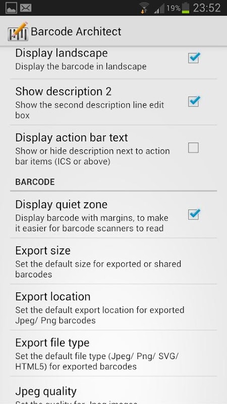 PNG, JPG, এটি SVG * বা HTML5 এর হিসাবে রপ্তানি এবং শেয়ার করুন বারকোড ** বিভিন্ন আকারের একটি সংখ্যা আপনার গ্যালারি বা এসডি কার্ড থেকে ফাইল (আকার এবং বিন্যাস সেটিংস মেনু নির্বাচনযোগ্য হয়). ই-মেইল / ফেসবুক / Google+ এবং অন্যান্য শেয়ারিং এবং সামাজিক সাইটের মাধ্যমে আপনার বারকোড ভাগ করে আপনার বন্ধু এবং সহকর্মীদের বিস্ময়াবিষ্ট.
