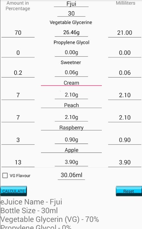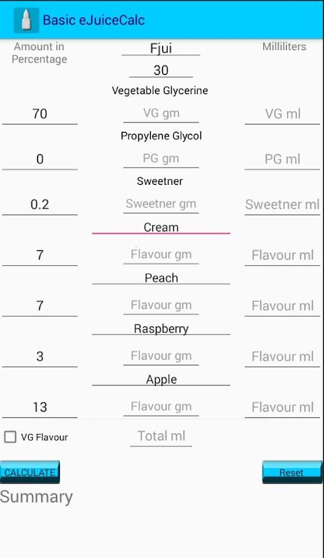 এটি একটি মৌলিক eJuice ক্যালকুলেটর, মিল, গ্র্যাম এবং শতাংশে প্রদর্শিত ইউনিট।