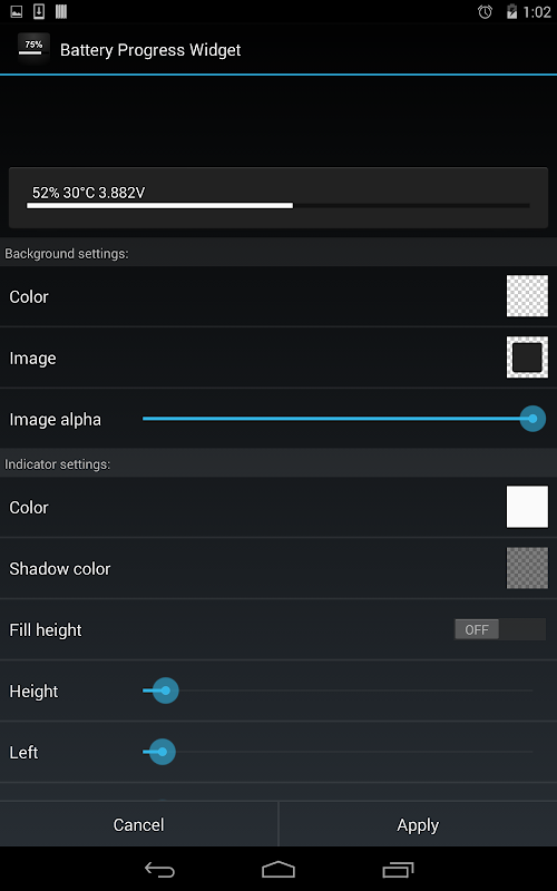 উইজেট (একটি অগ্রগতি বার মত) ব্যাটারি শতাংশ বার দেখায় এবং ব্যাটারি শতাংশ, তাপমাত্রা এবং ভোল্টেজ ধারণকারী একটি টেক্সট প্রদর্শন করতে পারেন.