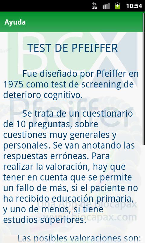 IMPORTANTE: BCX Pfeiffer es una aplicación pensada para su utilización por personal sanitario, cuidadores y familia. Cualquier mal uso o uso inadecuado de ella no es responsabilidad de los creadores. El profesional siempre deberá verificar la corrección de la valoración generada por la aplicación que es meramente orientativa y basada en el test original.