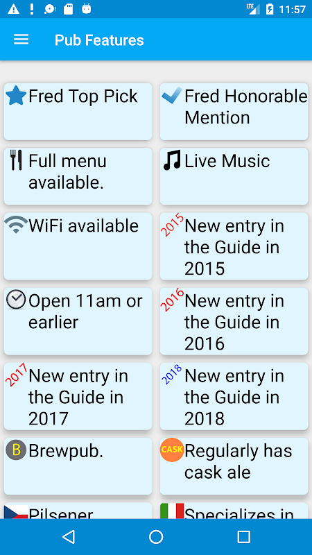 প্রতিটি ভুক্তি প্রতিটি পাব জন্য একটি পর্যালোচনা, আলোকচিত্র, নিকটতম বাস লাইন, যোগাযোগের তথ্য, ওয়েবসাইট ও টুইটার হ্যান্ডেল ধারণ করে। অ্যাপ্লিকেশন গিয়েই সংবাদের জন্য পাব এর টুইটার ফিড চেক করুন। একটি মানচিত্র পাব অবস্থান সেইসাথে নিকটবর্তী তালিকাভুক্ত আইস ক্রিম প্রদর্শন করবে।