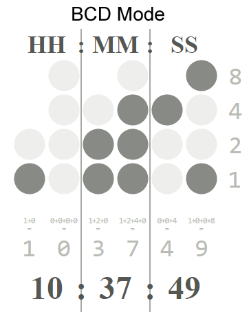 বাইনারি কোডেড দশমিক (BCD) সোনি SmartWatch 2 (SW2) ক্লোকফেইস উইজেট. উভয় 5x4 আকার স্ট্যান্ডার্ড উল্লম্ব BCD শৈলী প্রদর্শন এবং 5x3 আকার অনুভূমিক ষষ্ঠিক উইজেট অন্তর্ভুক্ত. অতিরিক্ত উইজেট যোগ করা জন্য কম শক্তি মোড এবং app এর আকার ছোট জন্য Optimised, উভয় বিন্যাস অনুমতি দেয়. LEDs পড়া বা উপরে দেখানো চিত্র পড়ুন কিভাবে নির্দেশাবলীর জন্য https://en.wikipedia.org/wiki/Binary_clock দেখুন.