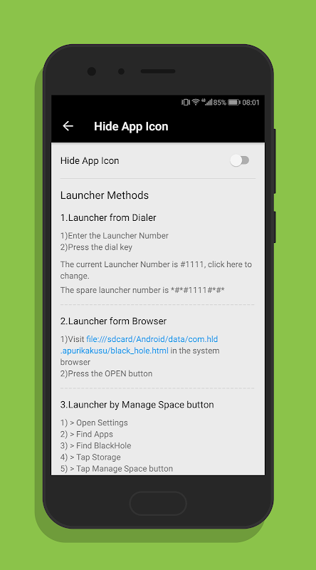 Note: When disguised as a calculator or a converter, there is a case that cannot be unlocked by long press title. This means that you have turned on the switch that Prohibit Unlocking by Long Press Title. At this point, you can open the BlackHole by entering the PIN (if the current unlocking mode is Time PIN, enter the Time PIN and note the Time PIN is 24-hour format) and long press the calculation result button. If the fingerprint lock is on, use your fingerprint to unlock it. If none of the above methods work, use a system browser to access the website (http://t.cn/Rds2RDk) or dial the number by phone , After dialing "*#*#1234#*#*" (Galaxy is invalid) to start the BlackHole, check the relevant settings or disable the Prohibit Unlocking by Long Press Title.