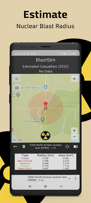 ব্লাস্টসিম পারমাণবিক বিস্ফোরণ সংরক্ষণাগার দ্বারা গবেষণা করা সূত্রের উপর ভিত্তি করে পারমাণবিক বিস্ফোরণ দ্বারা প্রভাবিত এলাকা গণনার জন্য একটি বিনামূল্যের অ্যাপ। সফ্টওয়্যারটি এমন ব্যবহারকারীদের জন্য তৈরি করা হয়েছে যারা পারমাণবিক বিস্ফোরণের ধ্বংসাত্মক প্রভাব সম্পর্কে আরও জানতে চান যা উচ্ছেদ পরিকল্পনার জন্য দরকারী। এই অ্যাপটি শুধুমাত্র কয়েকটি ট্যাপের জন্য সম্ভাব্য প্রভাবিত এলাকার পূর্বাভাস দেওয়া সহজ করে তোলে।