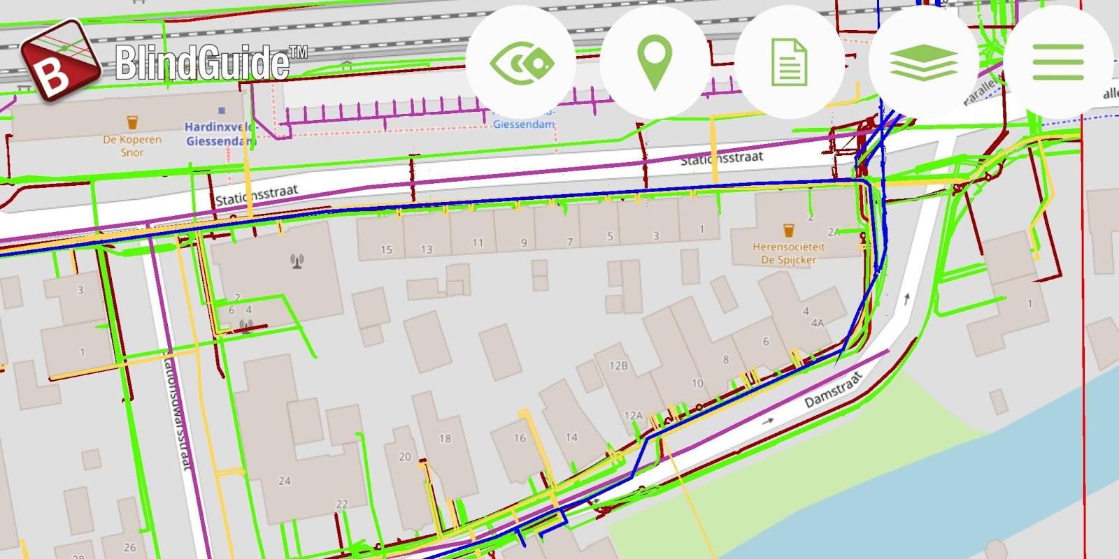 With the BlindGuide App, you can view geospatial information from drawings (such as Dutch Klic reports). In the screen, the user sees the map and his GPS position and the cables and ducts that should lie on that position projected on the drawings.