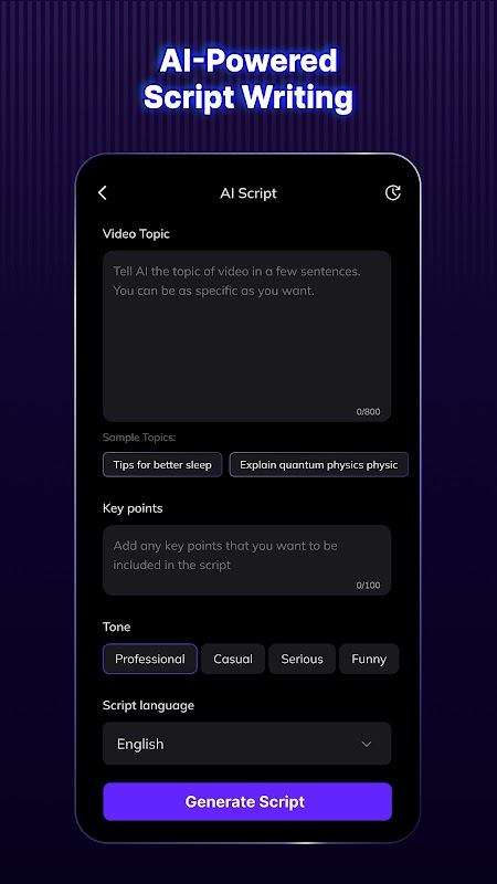 আপনার চিন্তাভাবনাগুলি লিখে রাখুন, এবং আমাদের AI সেগুলিকে একটি সমাপ্ত স্ক্রিপ্টে পরিণত করে, আপনাকে Vozo AI (ব্লিঙ্ক ক্যাপশন) দিয়ে আপনার বার্তা প্রদানের উপর ফোকাস করতে দেয়!