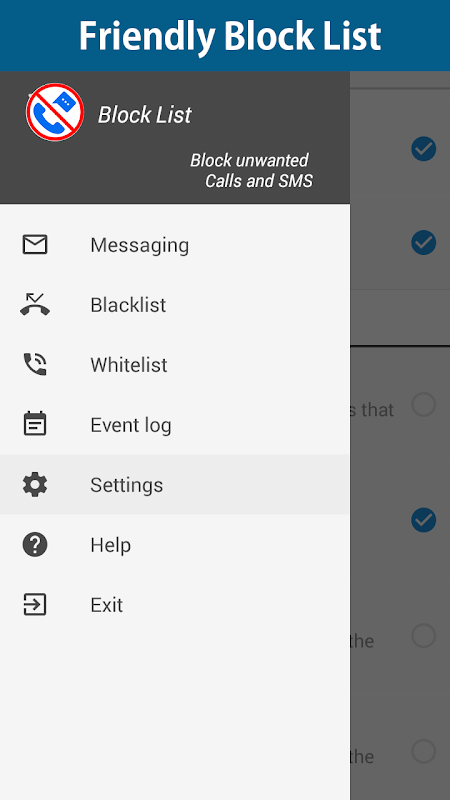 You can block SMS OR incoming calls easily with block list app, In the settings you have full control about notifications (on/off) vibration and much more! We keep it smart&simple for you!