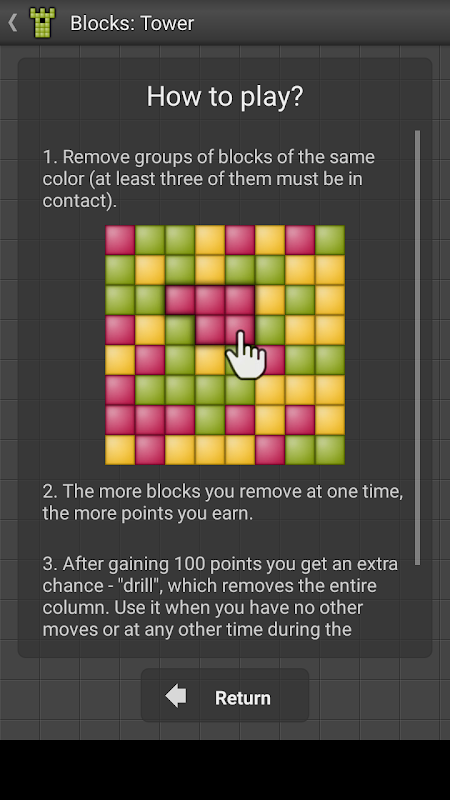 - After gaining 100 points you get an extra chance - "drill". Use it to remove the entire blocks' column.