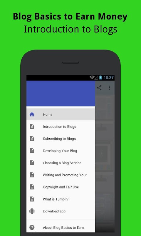 In this app, you'll learn about blogs, bloggers and how to earn money from your blog!