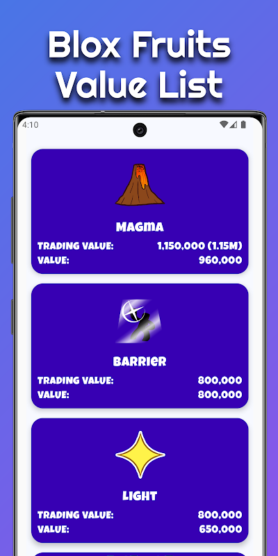 এটি এমন খেলোয়াড়দের জন্য একটি অ্যাপ্লিকেশন যারা মোবাইল ডিভাইস থেকে একটি সহজ এবং সহজ উপায়ে চমত্কার Blox Fuits এর ফলের আপডেট করা মান খুঁজছেন।
