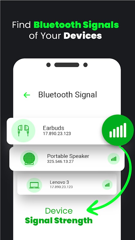 ব্লুটুথ ফাইন্ডার এবং স্ক্যানারে থাকা ব্লুটুথ শক্তি মিটার আপনাকে দুর্বল ব্লুটুথ সংযোগ এবং দুর্বল ব্লুটুথ সংকেত সনাক্ত করতে এবং ব্লুটুথ ফাইল ট্রান্সমিশন বাড়াতে রিয়েল-টাইমে আপনার লিঙ্ক করা ব্লুটুথ সিগন্যালের শক্তি পরীক্ষা করতে দেয়৷
