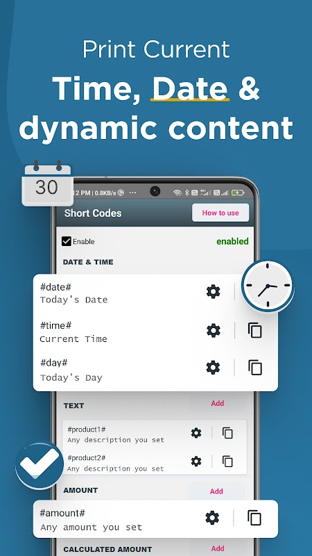 ⌚মাল্টি-ফাংশনাল অ্যান্ড্রয়েডের জন্য অন্যান্য মিনি প্রিন্টার অ্যাপের তুলনায়, থার্মার বর্তমান তারিখ, সময়, পরিমাণ এবং স্বয়ংক্রিয়ভাবে সংক্ষিপ্ত কোডের সাহায্যে গণনা মুদ্রণ করতে পারে।
