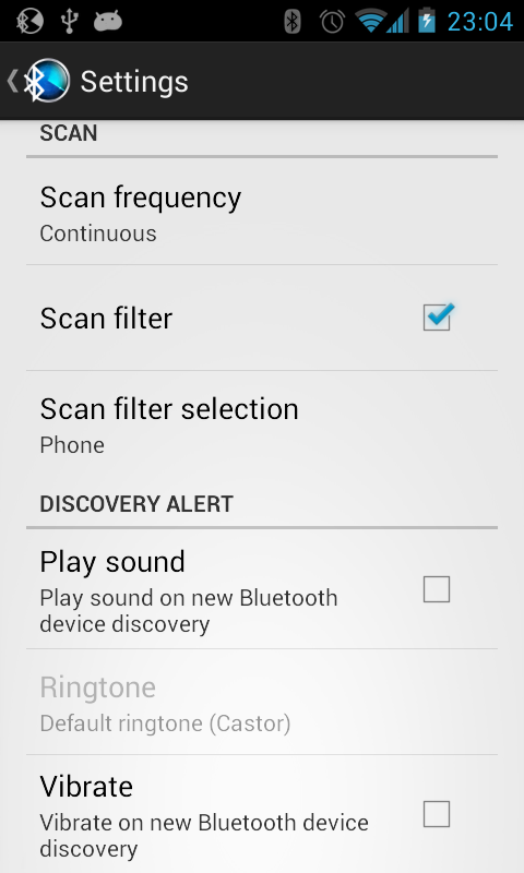 গ্রুপ স্ক্যান শুধুমাত্র যেমন ব্যবহারকারী কম্পন বা দ্বারা অবহিত ডিভাইস আবিষ্কার সতর্কতা সক্রিয় করা যাবে বস, বন্ধু, পরিবার, রোবট হিসাবে দলের সাজানো পূর্বে আবিষ্কৃত ট্র্যাকিং ডিভাইস নতুন ব্লুটুথ ডিভাইস আবিষ্কার কিন্তু না করতে পারবেন যে একটি বিজ্ঞাপন মুক্ত ব্লুটুথ স্ক্যানার অ্যাপ্লিকেশন নির্দিষ্ট দলের সীমার মধ্যে একটি নতুন ডিভাইস আছে যদি শব্দ. ব্লুটুথ ডিভাইস বর্গ দ্বারা ডিভাইসের ফিল্টার অপশন আছে. আবিষ্কার করা, ব্লুটুথ ডিভাইস discoverable মোডে হতে হবে.