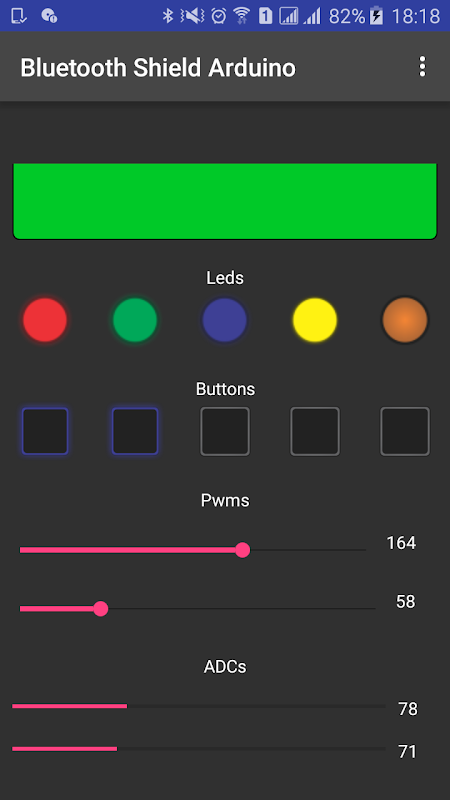 Through bluetooth connection you can use your android device as a arduino shield for IO visualization and control of arduino pins including the pwm pins.