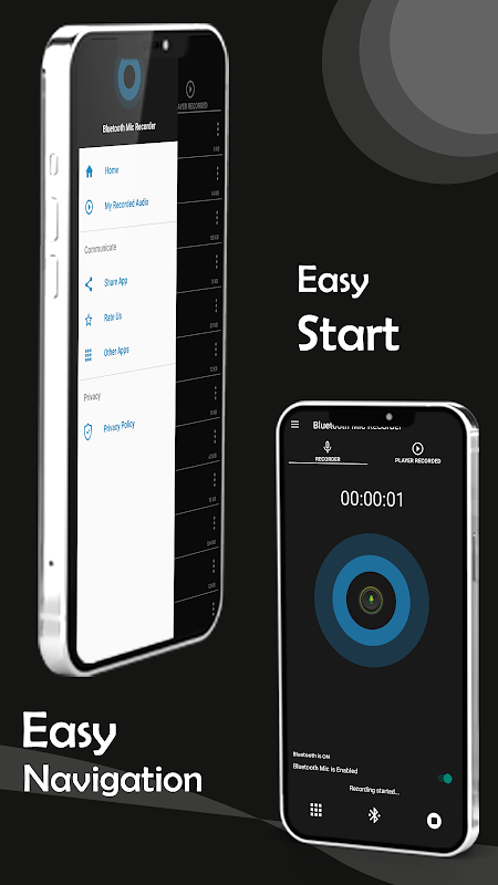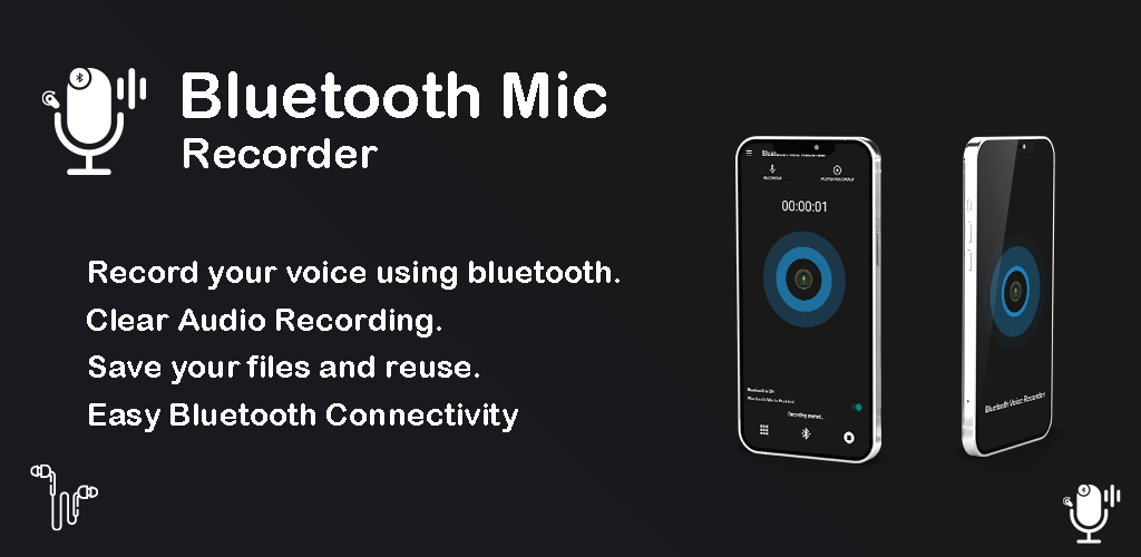 ব্লুটুথ মাইক ভয়েস রেকর্ডার অ্যাপ আপনার ব্লুটুথ মাইক ডিভাইসের মাধ্যমে আপনার ভয়েস রেকর্ড করে। আপনার মোবাইল আপনার থেকে দূরে রাখুন এবং অডিওর জন্য ব্লুটুথ মাইক ডিভাইস ব্যবহার করুন।