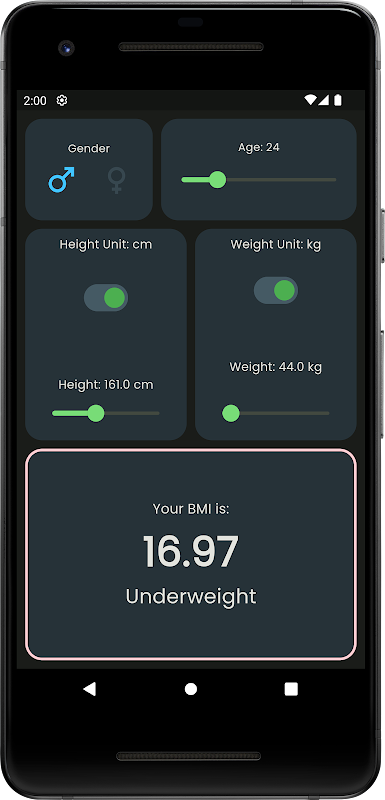 আপনার ফিটনেস যাত্রা ট্র্যাক করুন এবং আমাদের উন্নত BMI ক্যালকুলেটর দিয়ে একটি স্বাস্থ্যকর জীবনধারা বজায় রাখুন! এই অ্যাপটি আপনার উচ্চতা, ওজন, বয়স এবং লিঙ্গের উপর ভিত্তি করে আপনার বডি মাস ইনডেক্স (BMI) গণনা করার একটি দ্রুত, সহজ এবং নির্ভরযোগ্য উপায় প্রদান করে। তাদের শরীরের ওজন নিরীক্ষণ, স্বাস্থ্য ঝুঁকি বুঝতে এবং তাদের ফিটনেস লক্ষ্য সম্পর্কে সচেতন সিদ্ধান্ত নিতে চাইছেন এমন ব্যবহারকারীদের জন্য আদর্শ।