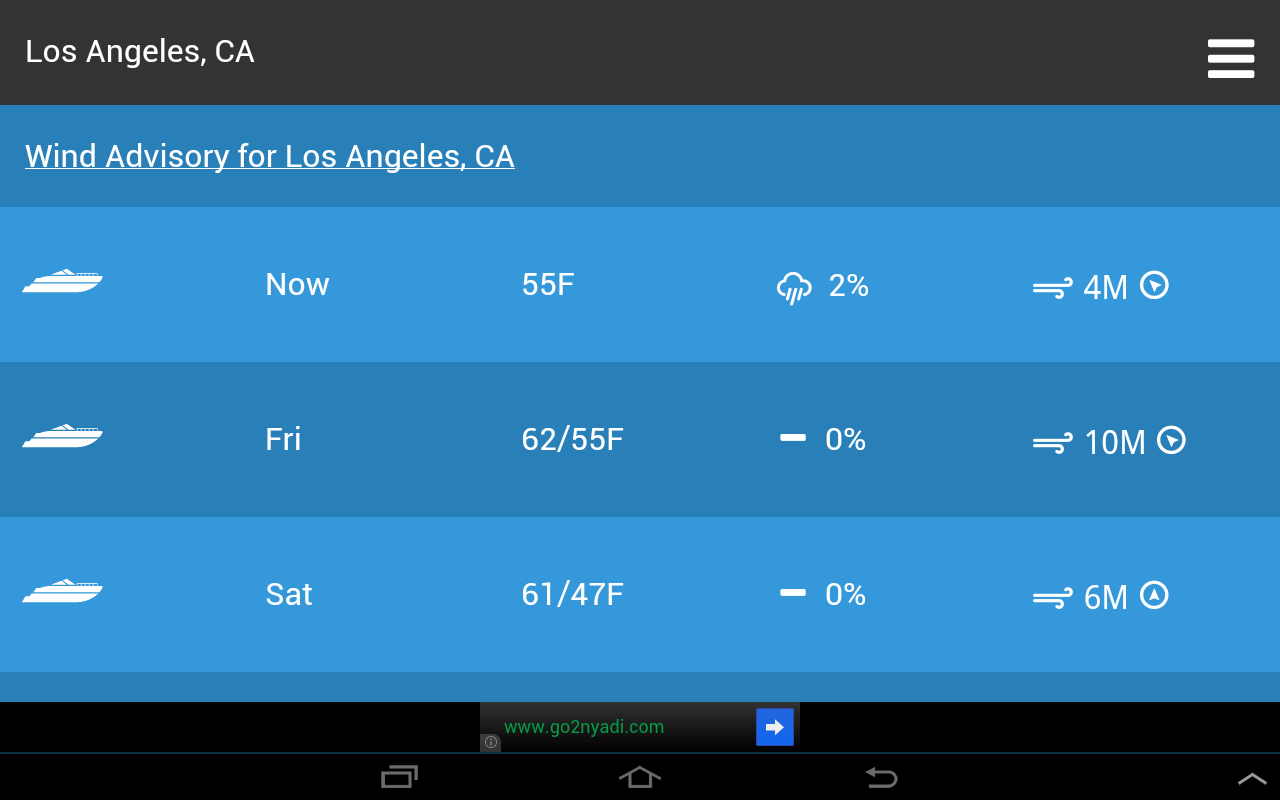 Boating Weather is a simple app used to determine if the weather forecast is good enough to go boating based on your preferences. Set your preferred weather conditions for temperature, rain, wind and a boat icon is displayed if the weather is within those parameters, a house icon is displayed otherwise.