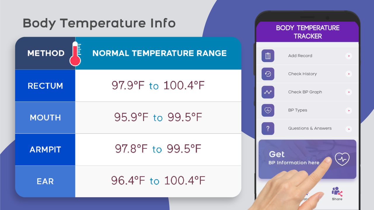 শরীরের তাপমাত্রা পরিমাপ অ্যাপ্লিকেশন তথ্য আপনাকে পূর্ববর্তী রেকর্ডগুলি সংরক্ষণ করার জন্য অ্যাপে প্রদত্ত মানগুলির সর্বাধিক এবং সর্বনিম্ন পরিসীমা দেয় এবং আপনাকে আপনার শরীর সম্পর্কে তথ্য দেয়।
