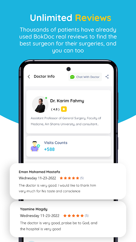 BokDoc হল মেনা অঞ্চলে সার্জারি ও চিকিৎসা পদ্ধতিতে বিশেষায়িত প্রথম বাজার, এতে 37টিরও বেশি বিভিন্ন চিকিৎসা বিশেষত্ব, 1500টি ডিআর এবং 75টি হাসপাতাল, 3000টিরও বেশি সার্জারি ও পদ্ধতি রয়েছে।