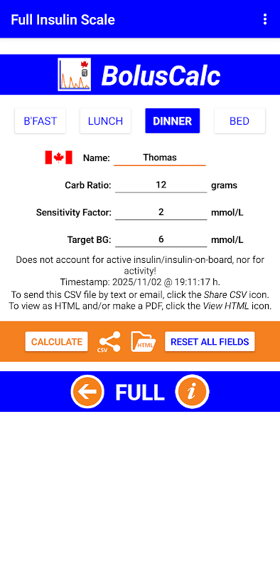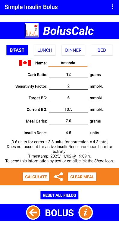 এই অ্যাপটি কানাডিয়ান হোম এবং স্কুল সেটিংয়ে ইনসুলিন ডোজের সহজ গণনার জন্য ডিজাইন করা হয়েছে (যদিও ইউএস মিলিগ্রাম/ডিএল রক্তের গ্লুকোজ ইউনিটেও গণনা করা যেতে পারে)। ৫ টি স্ক্রিন পাওয়া যায়: সিম্পল ইনসুলিন বোলাস স্ক্রিন কার্ব রেশিও, কারেকশন/সেনসিটিভিটি ফ্যাক্টর (আইএসএফ), টার্গেট বিজি (ডিফল্ট হল দিনের বেলা 6 mmol/L বা 100 mg/dL, এবং 8 mmol/L বা 120 mg/dL ঘুমানোর সময়), কার্বস খাওয়া এবং বর্তমান বিজি। সিম্পল ইনসুলিন স্কেল স্ক্রিন বেসলাইন ইনসুলিন ডোজ, আইএসএফ এবং টার্গেট বিজি -র উপর ভিত্তি করে খাবারে কার্বোহাইড্রেটের নির্দিষ্ট মাত্রায় থাকা মানুষের জন্য সরলীকৃত ইনসুলিন স্লাইডিং স্কেল তৈরি করে। ফুল স্লাইডিং স্কেল স্ক্রিন কার্ব রেশিও, আইএসএফ, এবং টার্গেট বিজি এর উপর ভিত্তি করে এমডিআই -তে থাকা মানুষের জন্য একটি সম্পূর্ণ ইনসুলিন স্কেল (সিএসভি, এইচটিএমএল বা পিডিএফ ফরম্যাটে) তৈরি করে। তীরের জন্য সংশোধন স্ক্রিন সিজিএমএস ব্যবহারকারীদের ইনসুলিন ডোজ (বা কার্বস) বৃদ্ধি বা হ্রাস গণনা করতে পারে ইতিবাচক বা নেতিবাচক দিকের তীরগুলির জন্য। স্কুলের সম্পদ স্ক্রিনে স্কুলের সেটিংয়ে ডায়াবেটিসযুক্ত কানাডিয়ান শিশুদের যত্নের জন্য নিবেদিত ওয়েবসাইটগুলির লিঙ্ক রয়েছে।