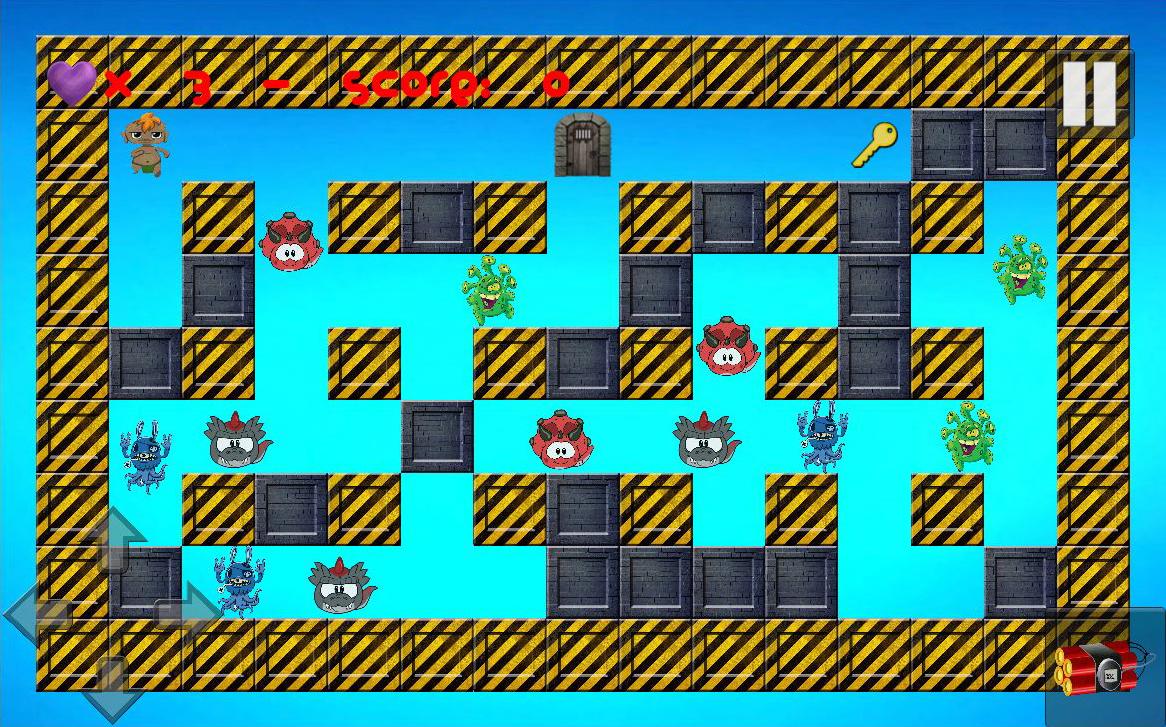 Bomber Game is an interesting game and will surely be what you are looking for. Your mission is to search key to unlock the door, enter in to the door to go to the next level, kill all enemies, and complete all the levels in challenge mode!