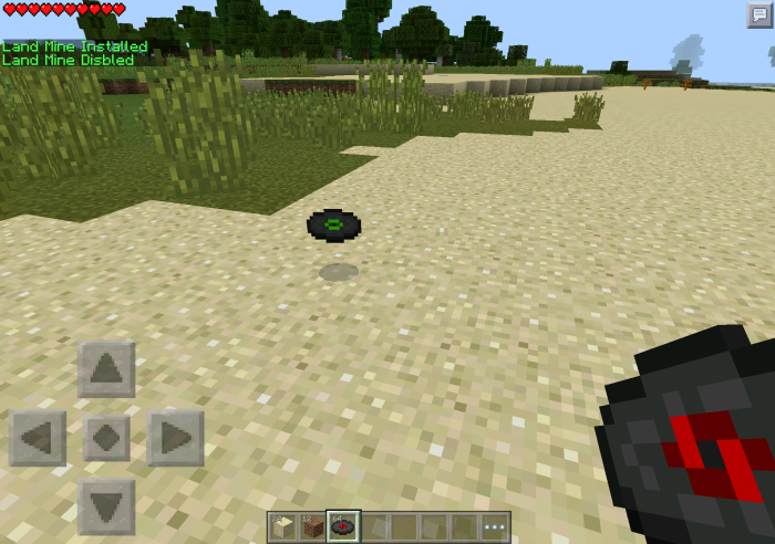 In total there are 15 different land mines which can be crafted with 1 redstone and 1 TNT. Each land mine is designed to fit in a specific biome texture wise. Down below you can see a Land Mine [Sand] planted on the ground in a sand biome.