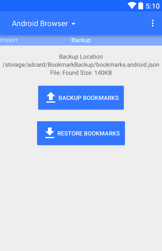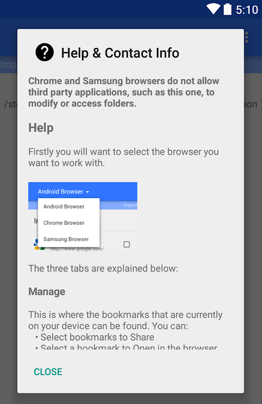 • ক্রোম এবং স্যামসাং ব্রাউজার তৃতীয় পক্ষের অ্যাপস তৈরি বা এক্সেস ফোল্ডার তথ্য করার অনুমতি দেয় না. আপনি এখনও আমদানি করতে পারেন, ব্যাকআপ, এবং পুনঃস্থাপন কিন্তু আপনার ফোল্ডার স্ট্রাকচার হারিয়ে যাবে. যদি কোন ভাবে এই আমি would এড়াতে ছিল, কিন্তু এটা কেবল সম্ভব নয়.