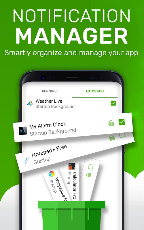 Our app will have access to your system data, that includes a list of installed apps, the installation folder contents as well as storage data and a status of currently running apps. By doing so our app will be able to fully operate and to have an effect on such options as Autostart (managing the apps that launch automatically and may cause additional system slowdown), Notifications (sorting and managing all the notifications) and Apps Manager (shows the list of installed apps and the memory they occupy).