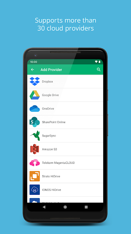 - বেশিরভাগ ক্লাউড স্টোরেজ সরবরাহকারী যেমন ড্রপবক্স, গুগল ড্রাইভ বা মাইক্রোসফ্ট ওয়ানড্রাইভ সমর্থন করে। সমর্থিত সরবরাহকারীদের সম্পূর্ণ তালিকার জন্য নীচে দেখুন
