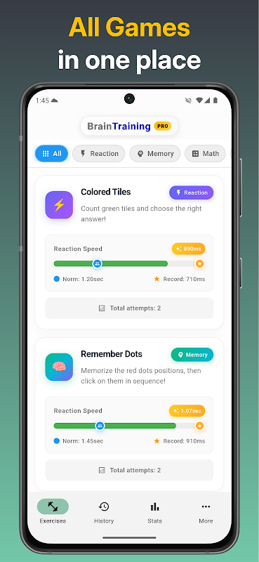 আমাদের বিজ্ঞান-সমর্থিত পদ্ধতি কার্যকর মানসিক প্রশিক্ষণকে আকর্ষণীয় গেমপ্লের সাথে একত্রিত করে। প্রতিটি সেশন আপনার কর্মক্ষমতার সাথে খাপ খাইয়ে নেয়, সর্বোত্তম চ্যালেঞ্জের স্তর নিশ্চিত করে। বিস্তারিত মেট্রিক্সের মাধ্যমে আপনার অগ্রগতি ট্র্যাক করুন এবং প্রকৃতপক্ষে কাজ করে এমন মস্তিষ্কের গেমগুলির মাধ্যমে প্রকৃত জ্ঞানীয় উন্নতির অভিজ্ঞতা অর্জন করুন।