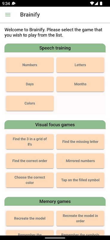 Brainify চারটি বিভাগে আপনার মস্তিষ্কের যত্ন নেওয়ার জন্য ডিজাইন করা হয়েছে: বক্তৃতা প্রশিক্ষণ, ভিজ্যুয়াল ফোকাস, স্মৃতি এবং গণিত।