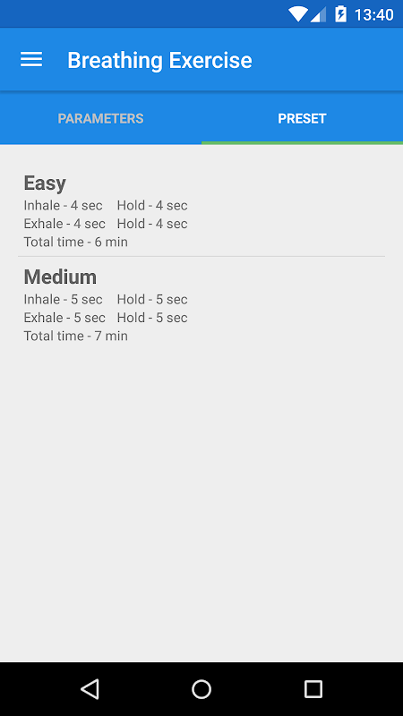 আবেদন শ্বাস ব্যায়াম "দ্বিঘাত শ্বাস" ব্যবহার ব্যায়াম জন্য ডিজাইন করা হয়েছে, "ত্রিভুজীয় শ্বাস" এবং "এমনকি শ্বাস."