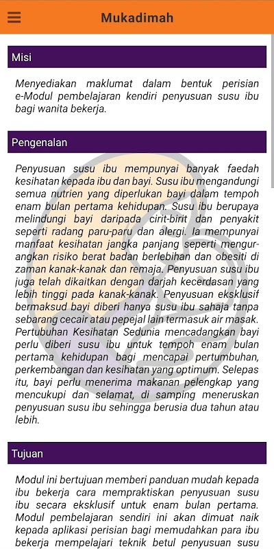Aplikasi ini bertujuan memberi panduan mudah kepada ibu bekerja cara mempraktiskan penyusuan susu ibu secara eksklusif untuk enam bulan pertama. Aplikasi ini juga memudahkan para ibu bekerja mempelajari teknik betul penyusuan susu ibu pada masa yang sesuai untuk mereka. Aplikasi ini menjadi panduan asas kepada persediaan awal bagi memastikan penyusuan susu ibu dan mempelajari sendiri teknik penyusuan susu ibu dengan betul dan berkesan.Ibu boleh mengenalpasti masalah penyusuan serta cara penyelesaian.