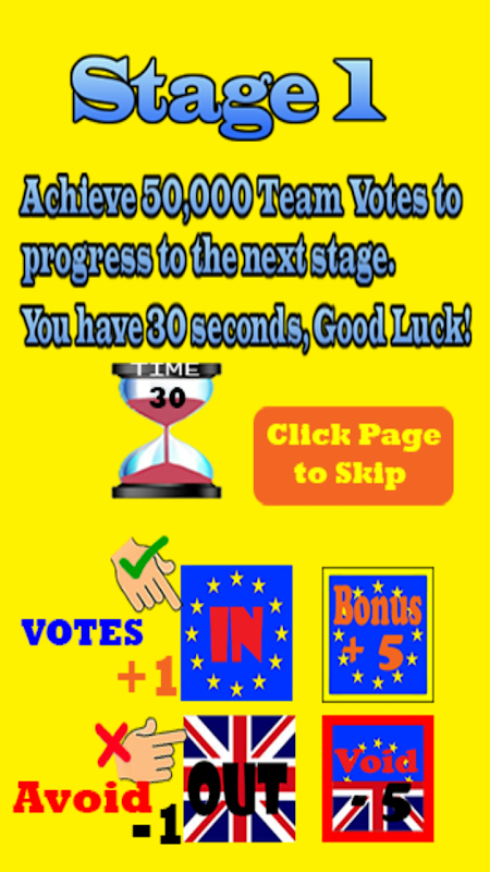 ব্রিটিশ থেকে প্রস্থান করুন ইইউ (Brexit ইইউ). উভয় দল বা টিম পছন্দ এবং লক্ষ্য সেট পূরণ এবং পরবর্তী পর্যায় সম্মুখের দিকে অগ্রসর করার যুক্তরাজ্যের প্রায় থেকে যেমন অনেক ভোট জয় করার চেষ্টা করুন. সেখানে সম্পূর্ণ করার পর্যায়ে 3 স্তরের হয় এবং প্রতিটি পর্যায়ে অসুবিধা এবং গতি বৃদ্ধি (কদর্য চমকের জন্য সতর্ক সতর্কতা অবলম্বন করা আবশ্যক).