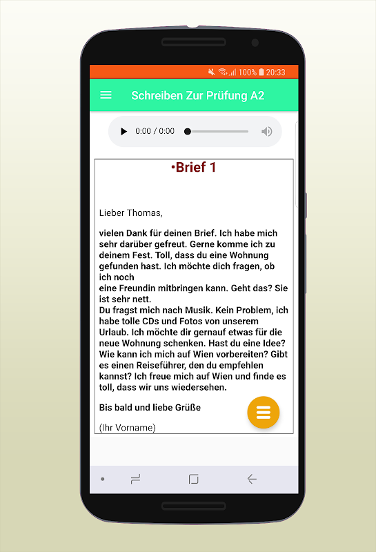 একটি সহজ ভাবে জার্মান শিখুন। একটি ইমেল পরীক্ষা সার্টিফিকেশন A2 লিখুন আপনি ব্যক্তিগত এবং আনুষ্ঠানিক ইমেল / চিঠি লিখুন এবং একটি ফোরাম পোস্টে আপনার মতামত প্রকাশ করে। আপনার জন্য সঠিক পরীক্ষা, যদি আপনার ইতিমধ্যে জার্মানির মৌলিক জ্ঞান থাকে। আপনি A1 A2 B1 B2 লেভেলের জন্য চিঠি বা ই-মেইল লেখার জন্য সঠিক অ্যাপ্লিকেশনটি ব্যবহার করেন। ব্যায়াম বিভিন্ন এবং ভাল গঠন করা হয়। দক্ষতা শোনার, লেখা এবং পড়া ব্যাপকভাবে প্রশিক্ষিত হয়। ব্যায়াম এবং উদাহরণ। এখানে ইমেল লেখার জন্য কিছু ব্যায়াম হয়।