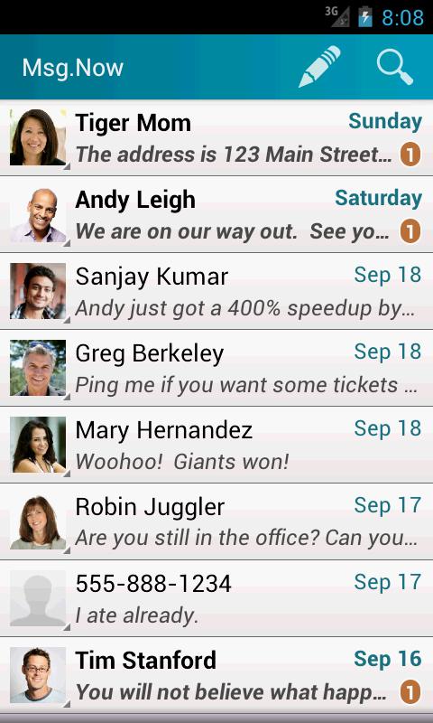 Msg.Now provides a rich and intuitive interface for sending and receiving SMS: